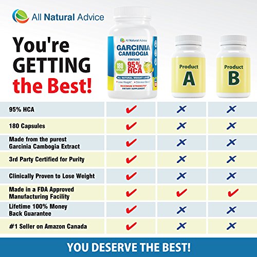 Why All Natural Advice? Canadian Company with the strongest HCA at 95% 1400 Mg per capsule serving and 180 capsules per bottle. We solely use nature’s greatest Garcinia pure extract. Every capsule Accommodates potassium and calcium and are simple to swallow. We are a trusted firm that strives for a optimistic consumer expertise every time.